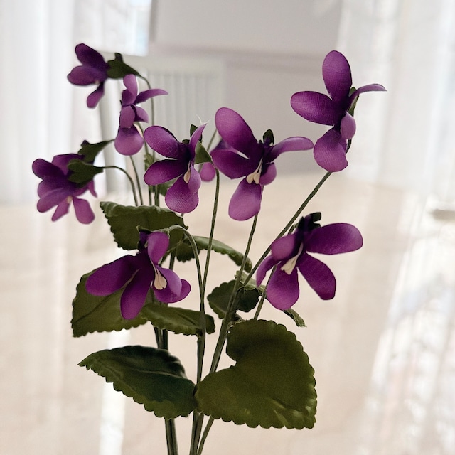 世界中どこを探しても無い、すみれの造花。 香り高いスイートバイオレットをイメージし すみれ好きのオーナーが特注でオリジナル制作しました。 硬いワイヤーが入っておりますので、花や葉っぱはお好きな角度に曲げる事ができます。 5本を纏めているため 一本ずつバラしてお使いいただくことも可能です。 すみれのクッキーと共に 素敵なティータイムをお過ごしくださいませ。